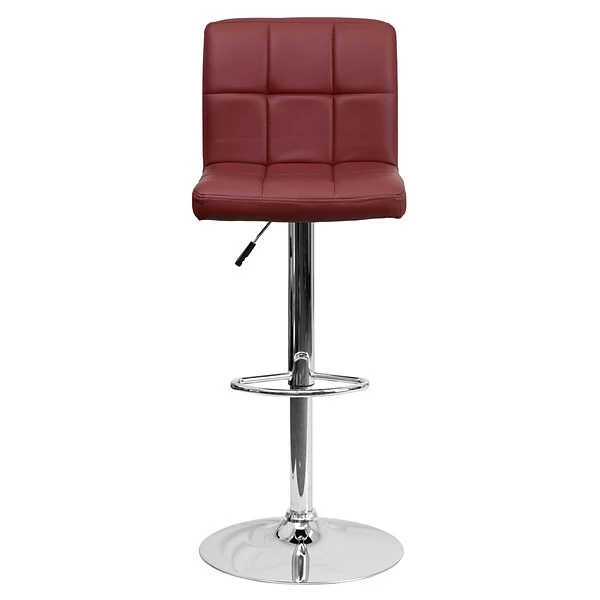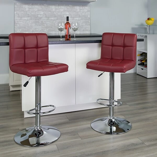 Let the plush quilted design of this this burgundy adjustable height barstool cradle you in comfort. The simple design allows it to seamlessly accent any area in the home. The easy to clean vinyl upholstery is an added bonus when stool is used regularly. The height adjustable swivel seat adjusts from counter to bar height with the handle located below the seat. The chrome footrest supports your feet and relieves pressure from your legs while also providing a contemporary chic design. To help protect your floors, the base features an embedded plastic ring. Not only is this stool stylish, but very comfortable providing you with an amazing sitting experience!