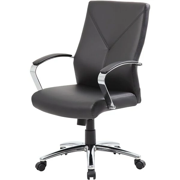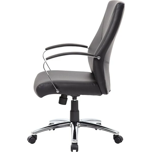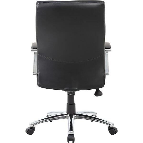 Beautifully upholstered in black LeatherPlus with metal chrome plated arms topped with soft arm pads. Features large 27″ chrome base with hooded double wheel casters.