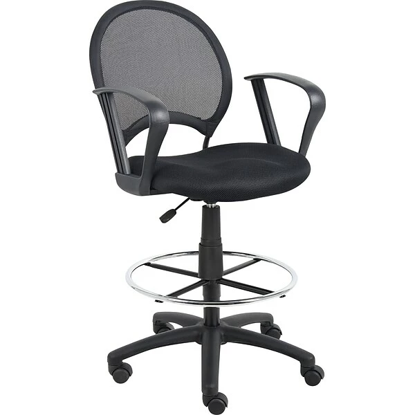 The Boss B16216 Mesh Back Drafting Stool features a metal frame mesh back and a modern look with height adjustable arms for added comfort.