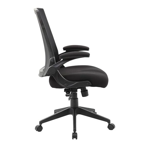 This task chair is a step ahead of the rest with the adjustable, flip arm design and the pneumatic gas lift that allows for easy height adjustments. Comfort and customization are top priority with the breathable mesh back design and with features such as a spring tilt mechanism, tilt tension and the upright lock. It also features a 25 inch nylon base with 2 inch nylon dual wheel castors for a smooth roll and a weight limit of 275 lbs.