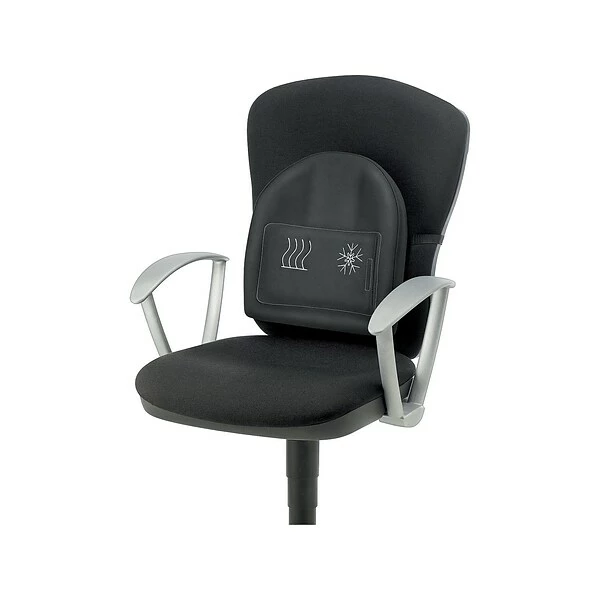 An adjustable strap with a buckle easily secures this back support to most computer and office chairs. The soothing lumbar comfort is also a welcome addition when used on hard wooden chairs during prolonged periods of sitting. This black back support features quality workmanship and attractive stitching accents depicting the hot and cold icons in contrasting colors.