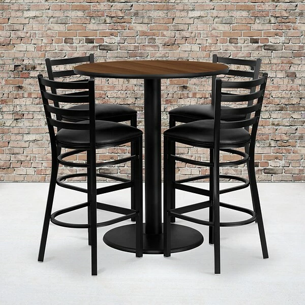 Don’t have time to search through hundreds or thousands of table and seating options? This complete Bar Height Table and Stool set saves you time to focus on your growing business. This set includes an elegant Walnut Laminate Table Top, Round Base and 4 Metal Ladder Back Barstools. Surface is heat, scratch and moisture resistant. Easily clean using a mild detergent and water, dry clean to keep your tables spotless. Use this setup in sports bars, banquet halls, restaurants, break room/cafeteria settings or any other social gathering. Mix in bar height tables with standard height tables for a more varied seating selection. Whether you are just starting your business or upgrading your home or business furniture this restaurant quality bar table set will round out your dining space.