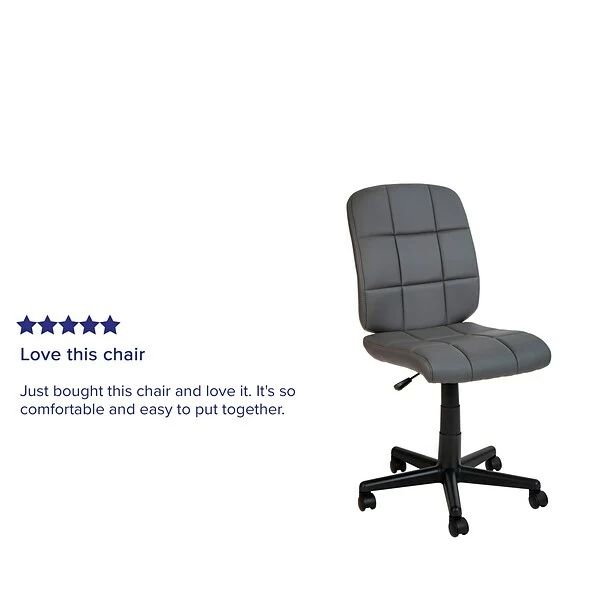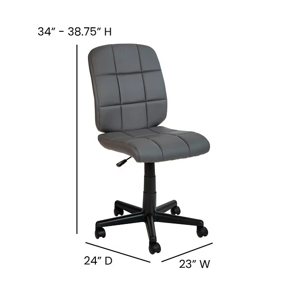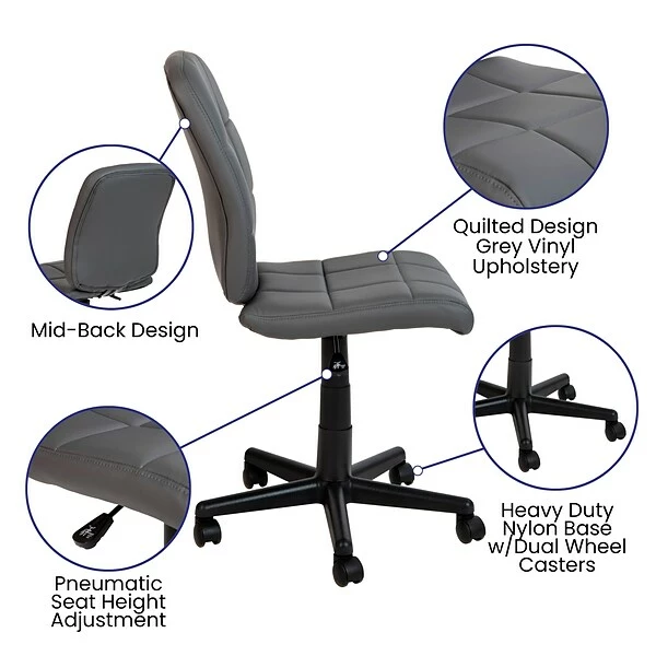 Give your workspace a different look with this computer task chair that features quilted, tufted upholstery. The streamlined silhouette allows more room for guests while the armless design lets you roll further under your desk or table. The versatile, on-trend look of this chair enables it to function in multiple capacities in the office from the receptionist’s desk to the conference room as well as your home office. A mid-back design offers support to the mid-to-upper back region. Upholstered in supple vinyl with biscuit tufting and generously padded with 2 inches of CAL 117 fire retardant foam, this swivel task chair will cradle you in comfort. The waterfall front seat edge removes pressure from the lower legs. A pneumatic seat height adjustment lever allows for a custom seating experience. This swivel task chair has a heavy-duty base with dual wheel casters and a 360 degree swivel seat.