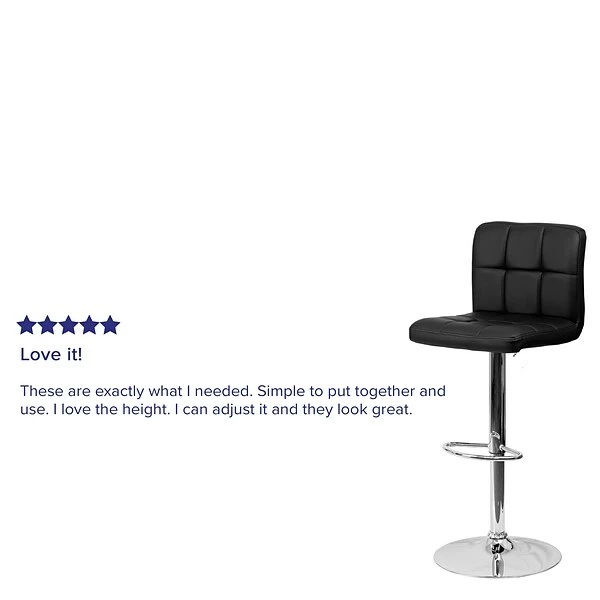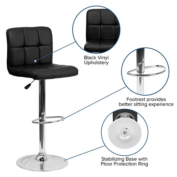 Let the plush quilted design of this this black adjustable height barstool cradle you in comfort. The simple design allows it to seamlessly accent any area in the home. The easy to clean vinyl upholstery is an added bonus when stool is used regularly. The height adjustable swivel seat adjusts from counter to bar height with the handle located below the seat. The chrome footrest supports your feet and relieves pressure from your legs while also providing a contemporary chic design. To help protect your floors, the base features an embedded plastic ring. Not only is this stool stylish, but very comfortable providing you with an amazing sitting experience!