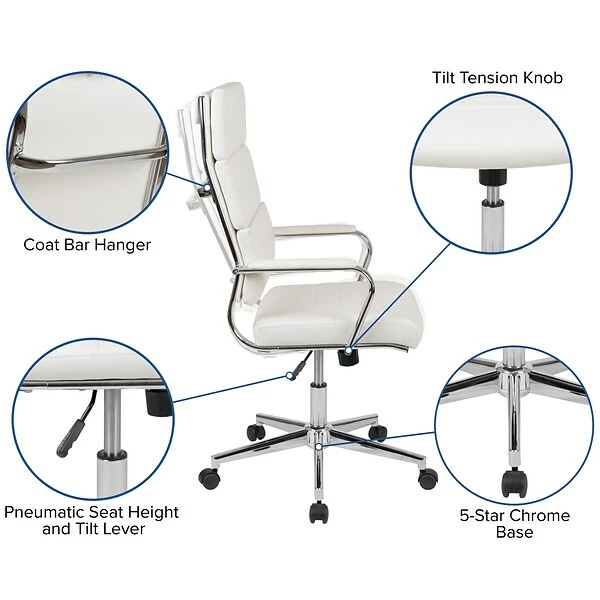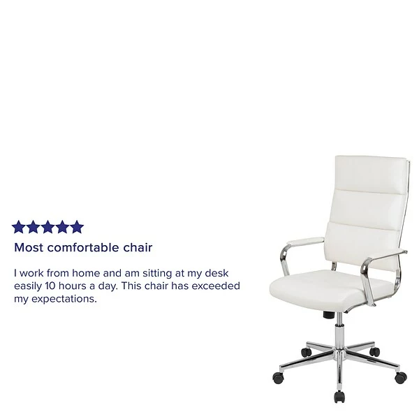 Bring your office into the new age with this stunning executive office chair. The panel back desk chair is easy on the eyes to bring instant value to your workspace. Impressive chrome arms with a padded layer provide support to your upper body while looking exquisite. Make a powerful impact in your conference room when taking meetings with clients and buyers with these high back conference chairs. Drape your jacket over the coat hanger bar to prevent from falling when getting in and out the chair. Adjust the chair to your desired height by utilizing the lever underneath the seat that also locks the chair in an upright position. When you want to lean back pull the lever out and use the knob to adjust the force that’ll be required to recline. Enjoy reliable support in this ergonomic office chair to support your while addressing customer concerns and day-to-day tasks.