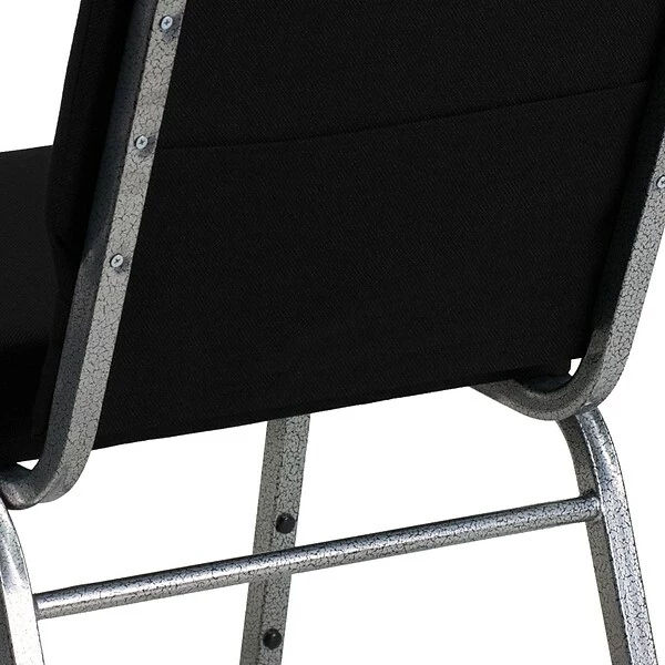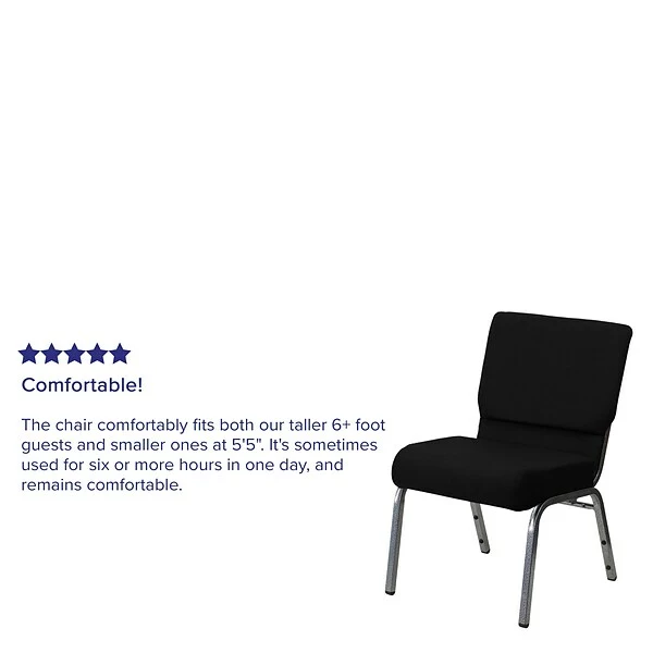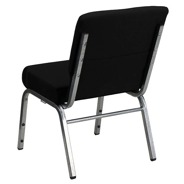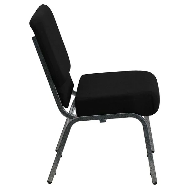 Flash Furniture HERCULESâ„¢ 21” extra wide Stacking church chair is black fabric upholstery made with 3.75” thick seat and silver vein frame finish. Chair with ganging clamps has waterfall seat that reduces leg strain.