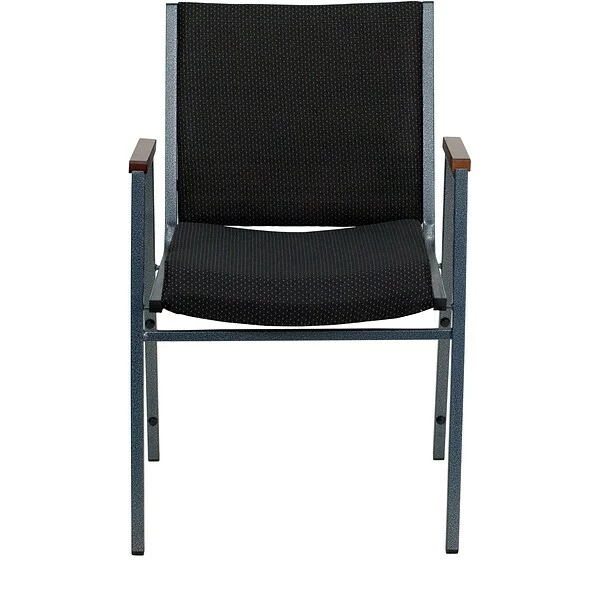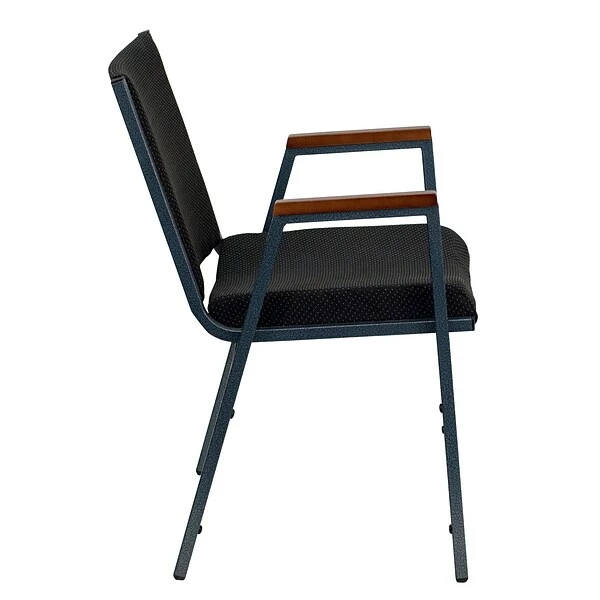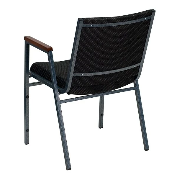 Flash Furniture HERCULESâ„¢ Heavy duty multi purpose stack chair with arms features 18 gauge high carbon steel for stability. Chair is made of black patterned fabric upholstery with 3” thickly padded seat offering comfort.