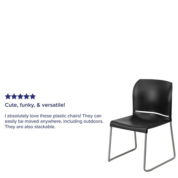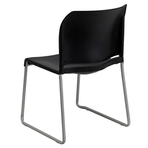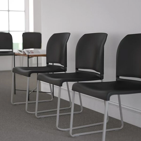 Provide comfortable seating in your lobby, cafeteria, breakroom, auditorium or office with this appealing sled base stack chair. Plastic stack chairs are popular chairs for temporary or permanent seating solutions and are ready-to-use with a fully assembled design. The silver powder coated sled base chair is stylish enough to be used as your modern dining chair and are easy to clean. Create an engaging atmosphere by using different colors in your training room or open workspace. Working in open industrial style offices can be distressing, adding colorful stack chairs around collaborative tables can make the space fun and inviting. These stackable guest chairs are designed to withstand constant use to keep up with the daily demands of your business. For transporting efficiency acquire our steel stack chair dolly.