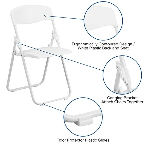 Plastic folding chairs are the choice of many event planners for their lightweight design, ease of cleaning, and versatility for events. This folding chair will make a practical choice in the home or for hosting outdoor events. The textured seat ensures safe and comfortable seating. After an event, you can stack them on top of each other or in a row.
