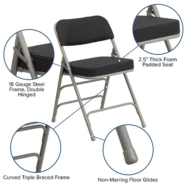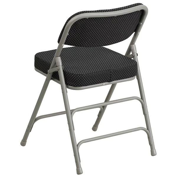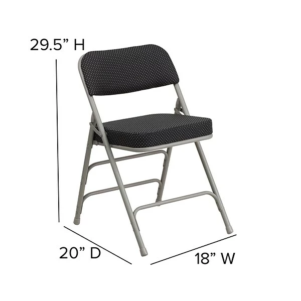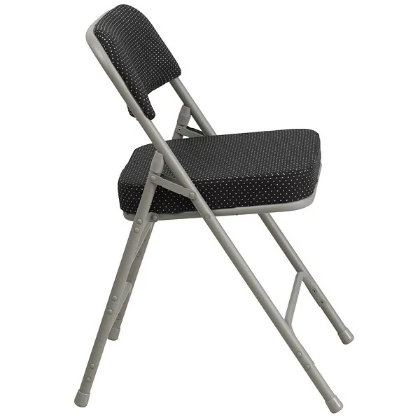 Guests will be amazed in the comfort of this Flash Furniture HERCULES Series ultra-padded upholstered metal folding chair. Whether you have planned for your guest’s arrival or had a sudden influx of family show up on your doorsteps, you’ll be well prepared with this padded folding chair. The chair provides comfort during extended meetings and social gatherings. Its 18-gauge curved powder-coated steel frame is triple-braced and double-hinged with leg-strengthening support bars to hold up to 300 lbs. Nonmarring floor glides on the legs protect your floors by sliding smoothly when you move it. Built for commercial use, this attractive chair is a smart seating solution for your next business meeting as well as in the home for family gatherings and other social events. After outdoor events, store indoors to protect the frame from extreme moisture. With nothing to assemble, this chair comes ready to service your needs.