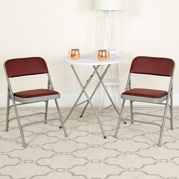 The perfect host is always prepared for that surprise guest and this Flash Furniture HERCULES Series classic upholstered metal folding chair is the perfect option to accommodate additional guests. This portable chair is popular at community centers due to its durability, compact storing capability, and ease of setup. The padded folding chair provides comfort during extended meetings and social gatherings. Its 18-gauge curved powder-coated steel frame is triple-braced and double-hinged with leg-strengthening support bars to hold up to 300 lbs. Nonmarring floor glides on the legs protect your floors by sliding smoothly when you move it. Built for commercial use, this attractive chair is a smart seating solution for your next business meeting as well as in the home for family gatherings and other social events. After outdoor events, store indoors to protect the frame from extreme moisture. With nothing to assemble, this chair comes ready to service your needs.
