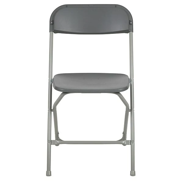 - Gray plastic chair with an 18-gauge powder-coated steel frame