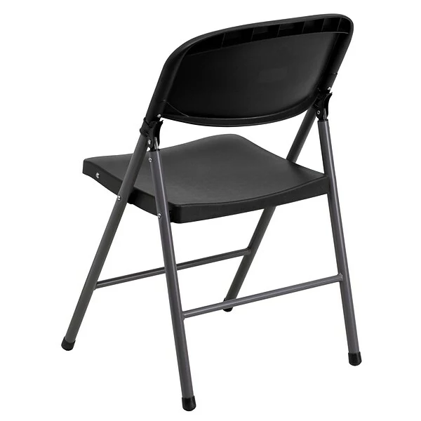 - Black plastic chair with 18-gauge steel frame, powder-coated in charcoal finish