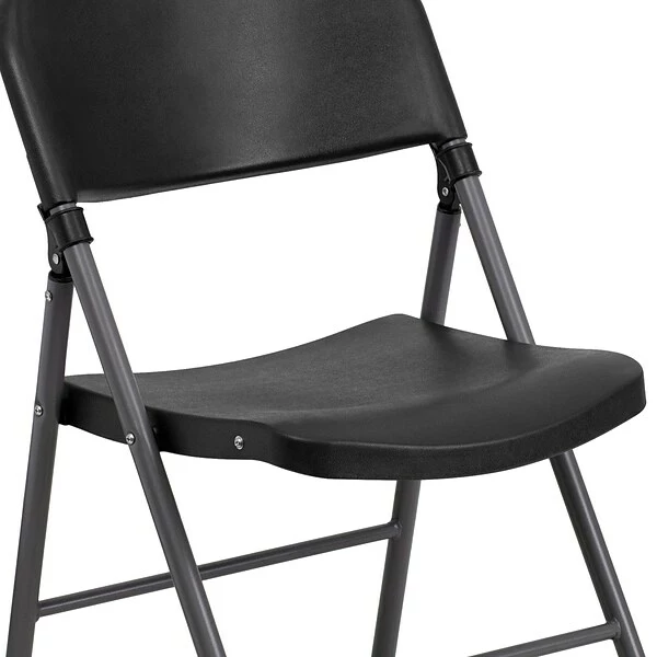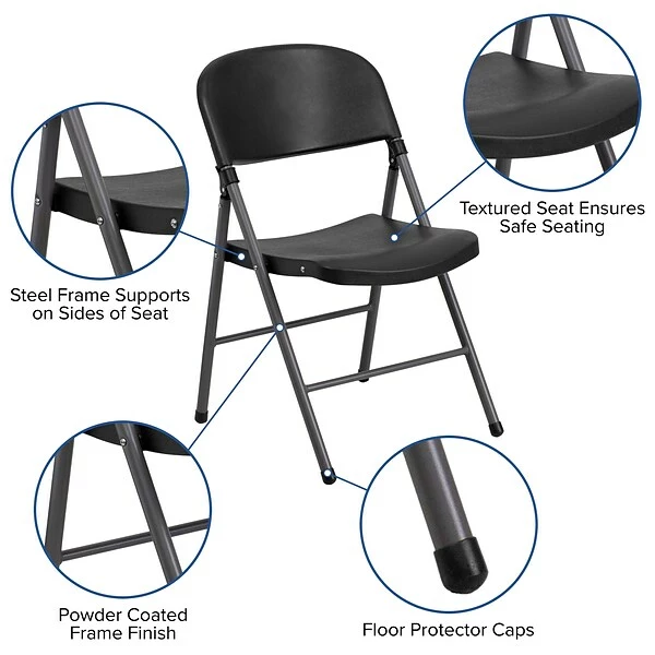 Feel free to host holidays this year or plan a perfect event or gathering with this black plastic folding chair with charcoal frame. A molded seat provides comfort to guests while the heavy-duty frame supports up to 330 lbs.. The textured seat ensures safe and comfortable seating. After use, place the chairs from the two-pack on top of each other or in a row. You’ll always have extra seating on hand for guests for a game night, party, and Thanksgiving or Christmas dinner. The plastic chair offers a versatile seating solution while being easy to maintain and is designed for portability.