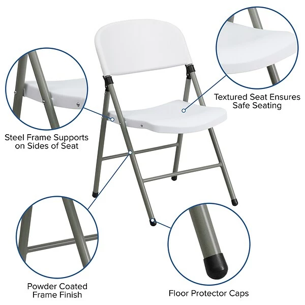 Feel free to host the holidays this year or plan a perfect event or gathering with this Flash Furniture HERCULES Series granite white plastic folding chair with gray frame. A practical choice for party rental companies, event venues, or for regular use in your home, this folding chair with steel frames is built to last. A molded seat provides comfort to guests while the heavy-duty frame supports up to 330 lbs. The textured seat ensures safe and comfortable seating. After use, place the chairs from the two-pack on top of each other or in a row. You’ll always have extra seating on hand for guests for a game night, party, and Thanksgiving or Christmas dinner. The plastic chair offers a versatile seating solution while being easy to maintain and is designed for portability.