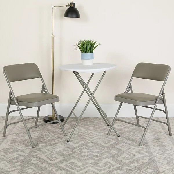 Host Thanksgiving at your house and leave out “bring your own chair” on the invite. Flash Furniture has got you covered with this two-pack of padded folding chairs. Each of these heavy-duty steel folding chairs is built for commercial businesses who host a myriad of events and need to accommodate people of varying sizes. Portable chair is perfect in community centers to transport from storage to venue floor. Change the scenery with this outdoor metal chair by taking the party outside. Take care of your chair, so it lasts you many years by storing indoors. Its 18-gauge curved steel frame is triple-braced with leg strengthening support bars to hold up to 300 lbs. while the nonmarring floor glides protect your flooring from scuffs and scrapes. Celebrate all family events at your home for guests to sit comfortably atop these upholstered folding chairs. The chairs come assembled to be of service as soon as they’re delivered.