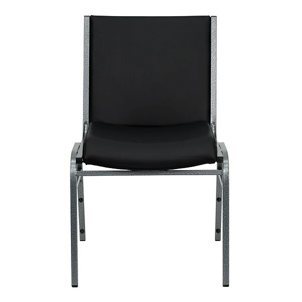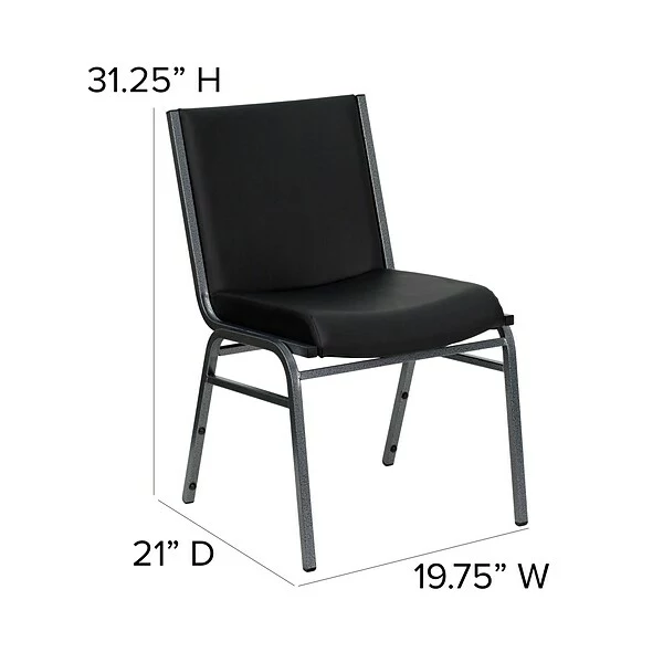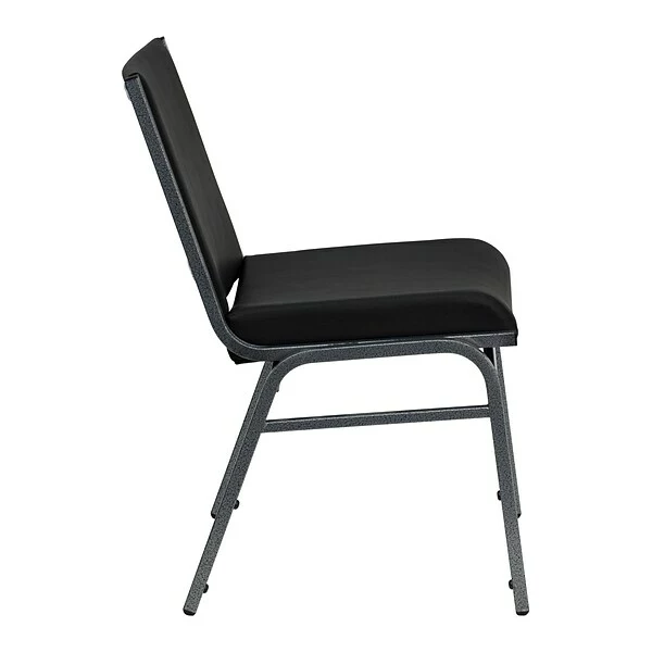 Accommodate guests with soft seating by using these black and silver chairs. The 3-inch seat and back padding provide added comfort during long sessions, and the heavy-duty square tubular frame supports up to 550 pounds. These Flash Furniture chairs can be stacked 12 high for storage in small spaces, and the plastic floor guides protect floors from scuffs and scratches.