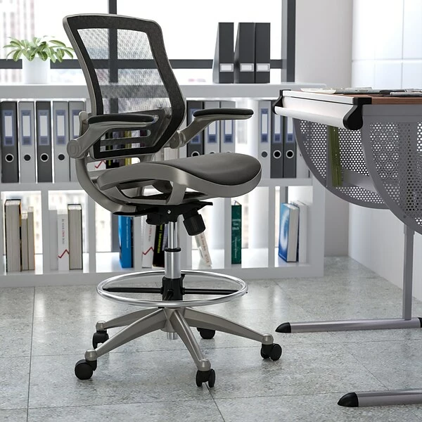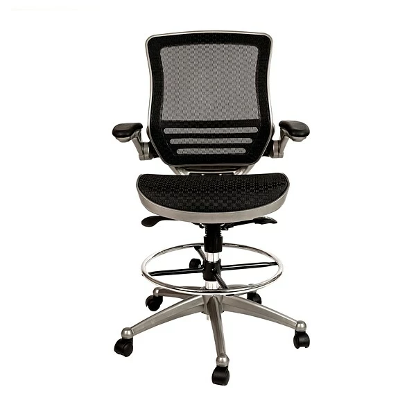 When you spend more time at your desk than anywhere else it’s time to invest in a top-notch chair. This high quality drafting chair is constructed with a higher seat range to reach counters and bars. Featuring breathable mesh material and extra padding throughout, this drafting stool will keep you cool and comfortable. Our adjustable-height drafting chair effortlessly raises and lowers via an easy-to-operate pneumatic adjustment lever while the integrated chrome foot ring provides a comfortable place for your feet to rest. The waterfall front seat edge helps reduce pressure on the lower legs. Padded armrests flip up and out of the way. Synchro-tilt control lets the chair’s seat and back recline at different rates and the contoured back with lumbar support may help to alleviate strain. 360 degree swivel paired with dual-wheel casters allows you effortless mobility. Spills clean up easily with a solvent based cleaner, no water required.
