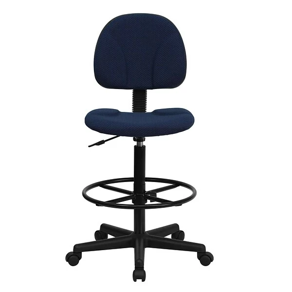 - The Flash Furniture navy blue ergonomic drafting stool features a heavy-duty nylon base and dual-wheel casters that provide robust, easy movement
