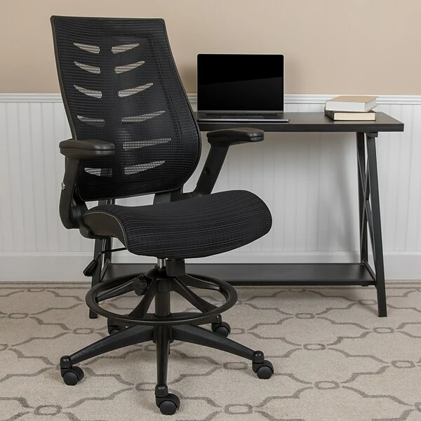 Make your daily tasks at work more pleasant with a high office chair designed especially for your high desk table needs. This tall task chair is ideal at sit-to-stand desks, standing desks, bar height tables and drafting tables. This mesh back drafting chair will make your receptionist’s desk look professional as visitor’s are being greeted. Enjoy the comforts of an ergonomic chair in a taller frame to meet the needs of students and professionals working at above average desk heights. No more miserable summer days at work when you have a mesh back office chair that’ll keep airflow circulating. The curved high back cradles you while offering built-in lumbar support. Designed with your comfort in mind. Draft chairs are essential for any profession where work surfaces are above standard height, such as lab technicians, architects, graphic artists, or any other creative assignment. They can also make a great chair for any job requiring employees to be at eye contact level with customers, such as receptionists or cashiers. Complete all tasks on this stylish draft chair that’ll keep you cool and comfortable throughout your workday.
