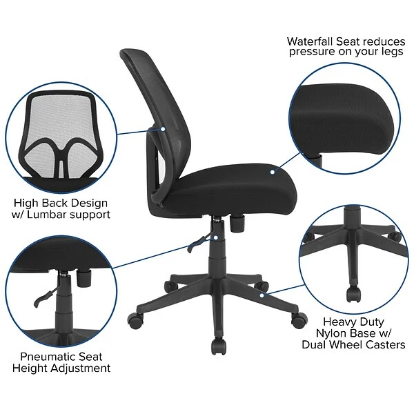 Breathe new life into your office, dorm or home office with this comfortable High Back Mesh Chair. The transparent mesh back allows air to circulate, keeping you cool no matter how high the pressure gets. The swivel seat is foam padded and has a waterfall front for leg comfort. Built-in lumbar support helps prevent back strain and muscle fatigue. Raise and lower the seat using the pneumatic seat height adjustment lever, conveniently located below the seat. The heavy-duty, nylon base with dual wheel casters makes it easy to roll across the floor. Whether you’re studying, browsing or on a tight deadline, this stylish chair will keep you cool and comfortable throughout your busy day.