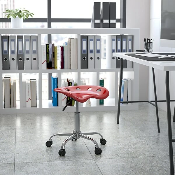 If space is at a premium in your office, then the Flash Furniture vibrant tractor seat can help you make the most of what’s available. The backless seat maximizes maneuverability while the pneumatic height adjustor allows you to quickly raise or lower the chair to suit your needs. The chair’s high-density polymer upholstery and chrome base are designed for durability, while its bright wine-red color adds a playful note to your office decor.