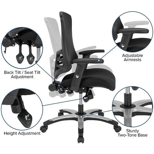 This swivel ergonomic office chair was built to maximize your comfort with its triple paddle functions while sporting a stylish black and silver 5-star base. Achieve comfort with the ergonomically designed molded foam seat. The transparent mesh back allows air to circulate to keep you cool. Built-in lumbar support helps prevent back strain and you can adjust the back height a full 2″ up and down. Easily adjust the back angle, seat height and tilt angle using three paddle mechanisms conveniently located under the seat. The locking back angle adjustment lever changes the angle of your torso to reduce disc pressure. Turn the tilt tension adjustment knob to increase or decrease the amount of force needed to rock or recline. Lock the seat in place with the tilt lock mechanism. When in need of a workhorse, this High Back Black Mesh Multifunction Executive Swivel Chair with Molded Foam Seat and Adjustable Arms will deliver results.