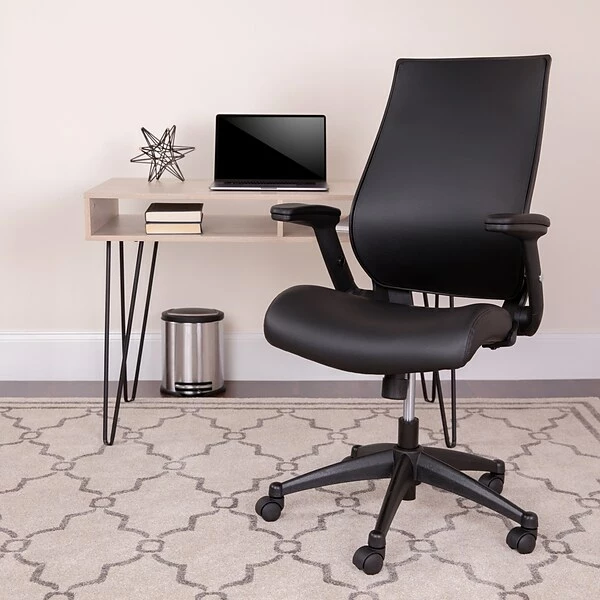 Feel like an executive when you pull this chair up to your professional office desk. This office chair showcases a comfortably molded seat and slim profile back with flexible covering. This ergonomically contoured chair will give you the support that you need to complete a day’s work. Turn the tilt tension adjustment knob to increase or decrease the amount of force needed to rock or recline. Lock the seat in place with the tilt lock mechanism. Chair rotates 360 degrees to provide easy access to a greater range of area. A pneumatic seat height adjustment lever lets you easily position the chair at a height that is most comfortable for you. Adjustable armrests provide support by relieving the pressure off the shoulders and neck. Take your office space to new heights with this High Back Black LeatherSoft Executive Swivel with Adjustable Armrests.