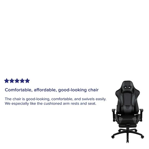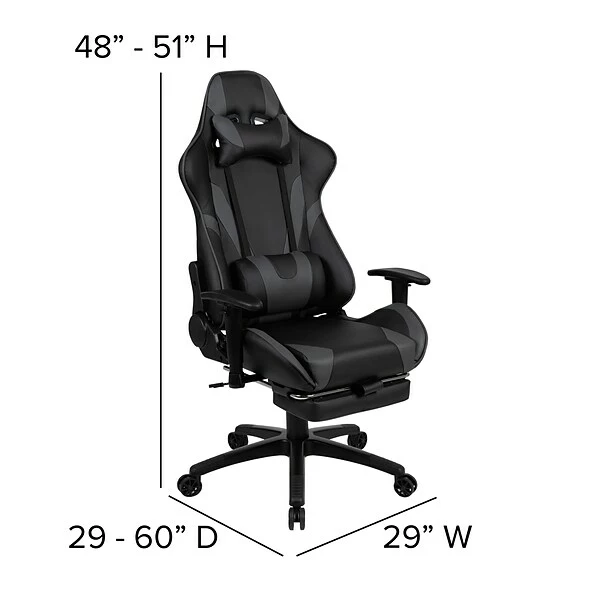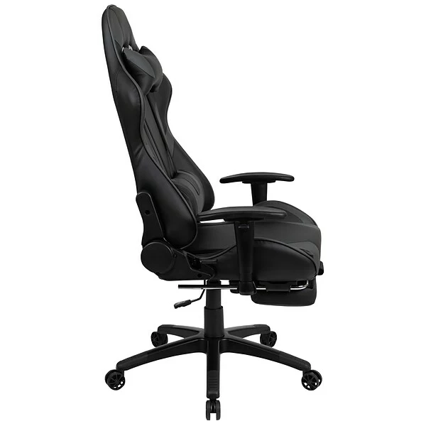 Have game day any time on your PC or with your console of choice with this gray racing gaming chair. Featuring a reclining back and slide-out footrest covered in soft and durable LeatherSoft upholstery, this high back ergonomic office chair is a must have. Adjustable headrest and lumbar pillows can be repositioned where you need them or removed. Adjustable pivot arms relieve pressure from your neck and shoulders. Slide the extended footrest out by pulling the loop then flipping the footrest up to properly elevate your feet. A separate lever reclines the back 87° ~ 145° while the lever underneath the seat controls the seat height and locks the chair in an upright position. This faux leather gaming chair cleans up easily with a solvent and water based cleaner such as foam. Complete your gaming experience with our black gaming desk with cup holder, headphone hook, and monitor/smartphone stand.