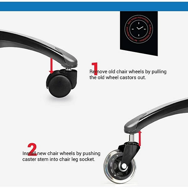 - Very easy to install. Pull out the old chair casters and push in your new wheels till they are firmly seated and secure.