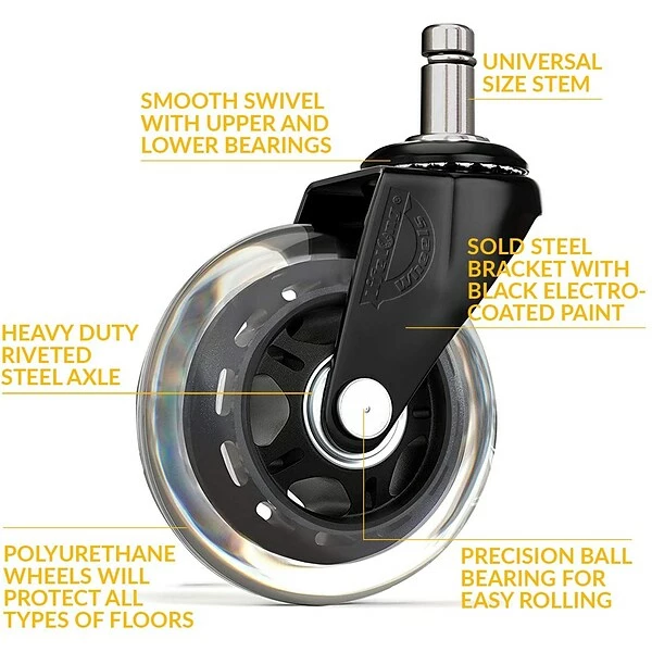 The chair casters are encased with a gentle polyurethane material to ensure that the wheels do not scratch or leave marks on the floor. They are a universal fit and easy to install. The casters are designed to enable you to glide freely through you office without any squeaky noise.