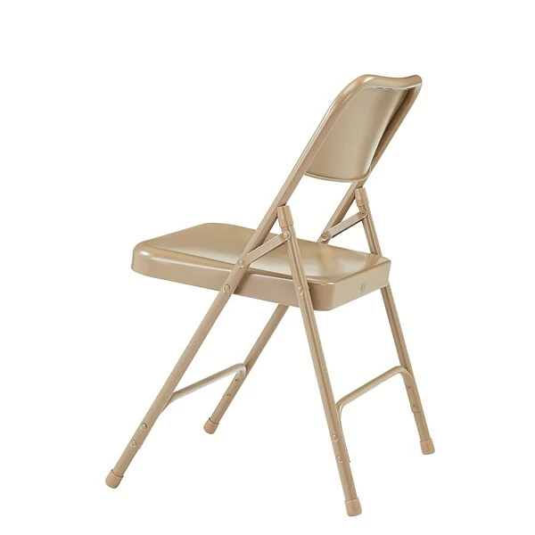 National Public Seating Premium folding chair in beige color has waterfall front edge for reducing pressure on the back of knees. Chair is made up of 18 gauge steel tubing with two double-riveted cross braces for added durability.