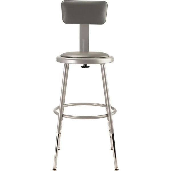 These reliable stools feature a sturdy frame of 18-gauge steel tubing securely welded to a 14 inch diameter seat pan. Riveted through the steel pan are . 5 inch -thick Gray vinyl cushioning that will provide years of dependable use. Footrest ring is securely bonded to each leg with four spotwell contact points. Height-adjustable legs extend from 19 inches to 27 inches in 1-inch increments and adjustable padded backrests can be moved 2 inches up/down and forward/back.