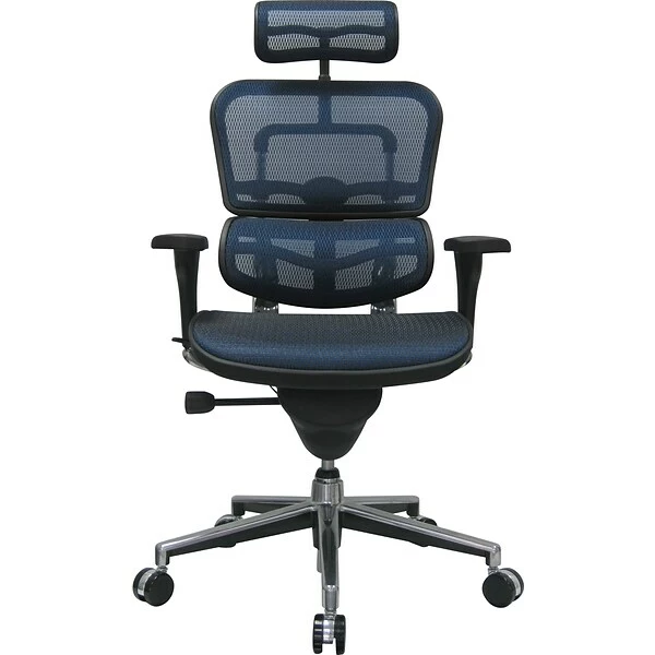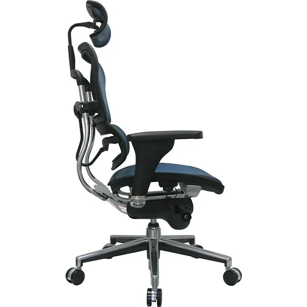 Work at your desk in comfort with the Raynor Eurotech Ergohuman high-back manger’s chair. Its blue color and mesh fabric combine style and comfort, giving you a chair that’ll look great in your office. Its fully adjustable back, headrest, and seat mean you can customize the chair to your preferences. You’ll even be able to choose between three different angles for leaning your chair back when you want to relax for a few moments.