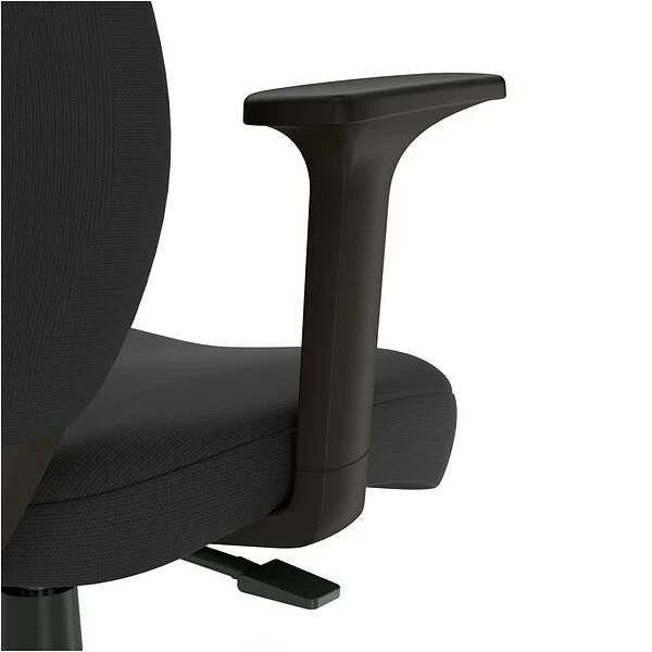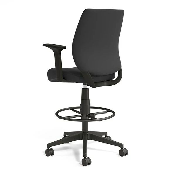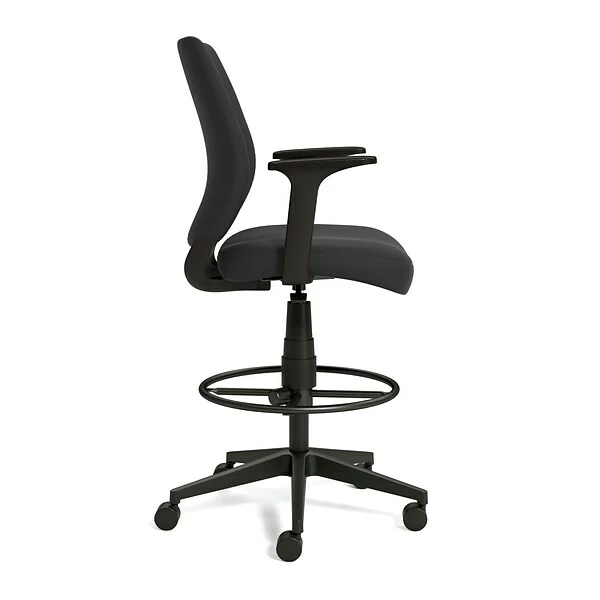 Get premium back support during long workdays from this black fabric stool. The adjustable seat height allows easy customization and accommodates different preferences, while the premium fabric upholstery offers breathable comfort. Five 360-degree casters let you move from your desk to the nearby print station in a fluid glide, and the convenient foot ring provides support for your tired feet. The contoured and cushioned seat offers plush comfort. This Essentials black fabric stool features fixed armrests for additional support and meets ANSI/BIFMA standards for quality, safety, and performance.