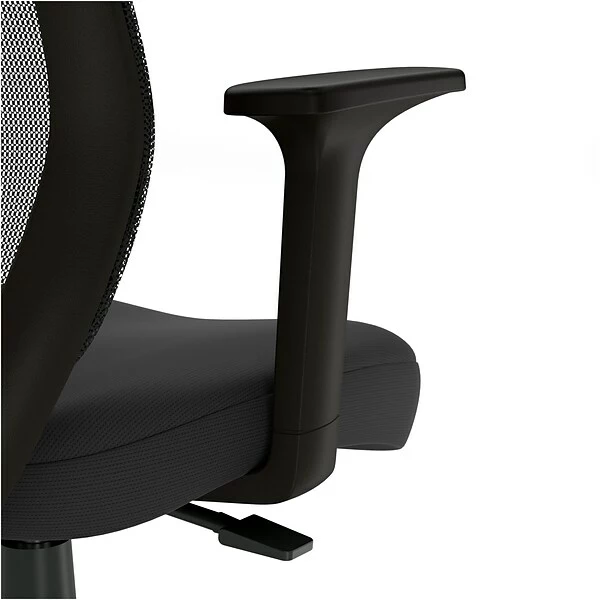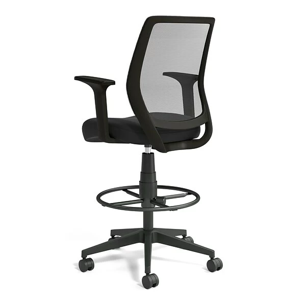 Personalize your seating experience with this mesh and fabric stool. An included tilt tension knob lets you effortlessly recline, while the mesh back allows free air circulation. With adjustable seat height, this stool helps ensure good posture and easy viewing posture. The contoured padded seat provides ergonomic comfort, and an armless design fits easily in small cubicles. This Essentials black mesh and fabric stool has a five-star base and casters for easy maneuverability, and the foot ring supports your feet.