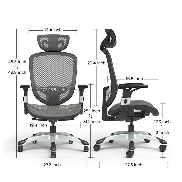 - Overall dimensions: 45.28-49.76″H x 27.1″W x 27.2″D ; Seat dimension: 17.24-20.98″H x 19.37″W x 16.77″D ; Back dimensions: 16.43″W x 23.43″D